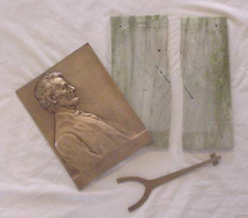 Lincoln Plaque with broken marble backing and stand, before restoration.